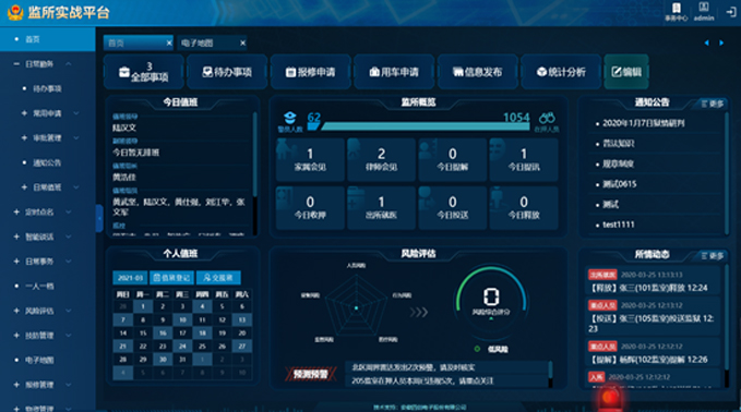 監(jiān)所實戰(zhàn)平臺以監(jiān)所實戰(zhàn)業(yè)務為導向,以物聯(lián)網(wǎng)、大數(shù)據(jù)為手段,升級、完善、整合安防系統(tǒng)和被監(jiān)管人員信息系統(tǒng),實現(xiàn)監(jiān)所技防管理、動態(tài)信息主導勤務、風險評估、執(zhí)法監(jiān)督四大業(yè)務功能,旨在提高監(jiān)所風險預警和突發(fā)事件處置能力,是監(jiān)所實戰(zhàn)管理的“大腦中樞”。